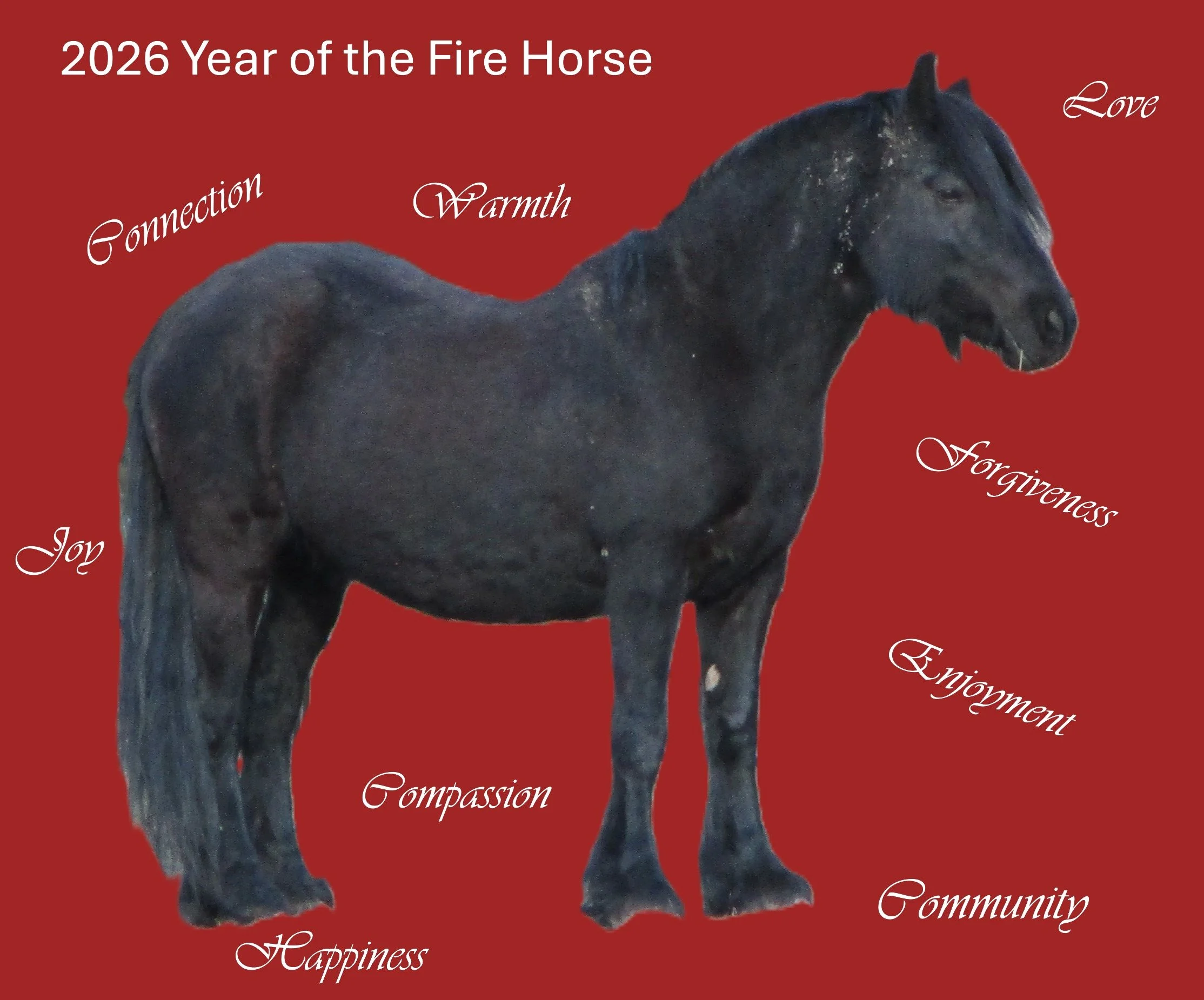 One of the Five Elements is ‘Fire,’ and I learned in my course work an interpretation of the Fire Element that is much more attractive to me going into the Chinese New Year with my ponies. Fire is associated with the heart, among other organs. Characteristics of love, joy, connection, compassion, community, and forgiveness are associated with the element. For me, a focus on these characteristics will be very helpful moving through this coming year as a source of the clarity that any intensity will require.